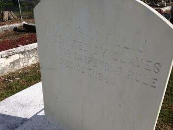 The tombstone implies much.  Dates were not kept well among the poor in St. Bernard Parish, and the “1869” date makes me believe it was probably erected decades after as the story passed through oral tradition.  The usage of “assassination” implies San Feliu was of some importance to the community.  Those who erected the tomb still considered freedpeople “slaves” or they could not remember if slavery was abolished yet or not.  They also put all blame on carpetbaggers.